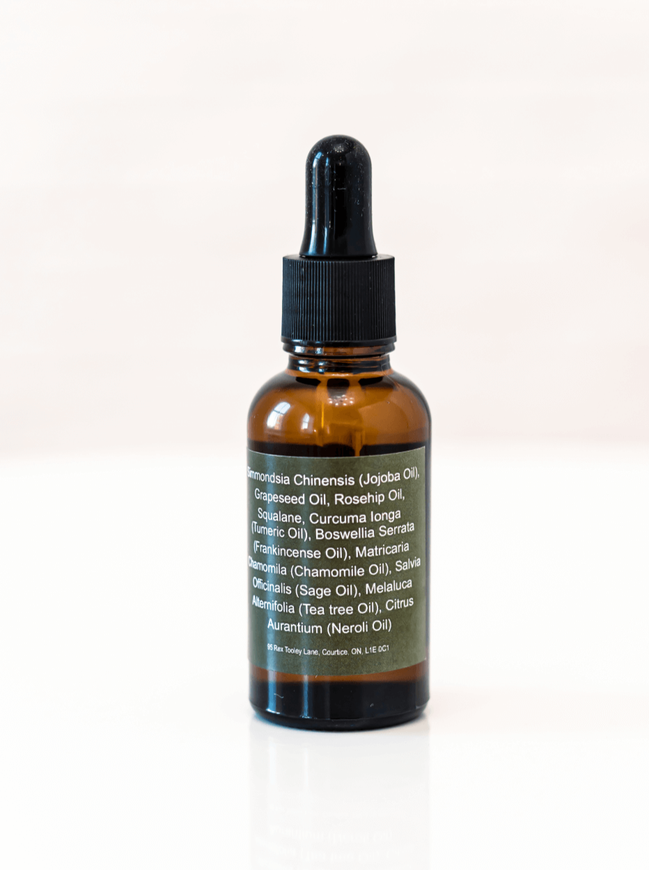 Simmondsia Chinensis (Jojoba Oil), Grapeseed Oil, Rosehip Oil, Squalane, Curcuma Ionga (Tumeric Oil), Boswellia Serrata (Frankincense Oil), Matricaria Chamomila (Chamomile Oil), Salvia Officinalis (Sage Oil), Melaluca Alternifolia (Tea tree Oil), Citrus Aurantium (Neroli Oil)