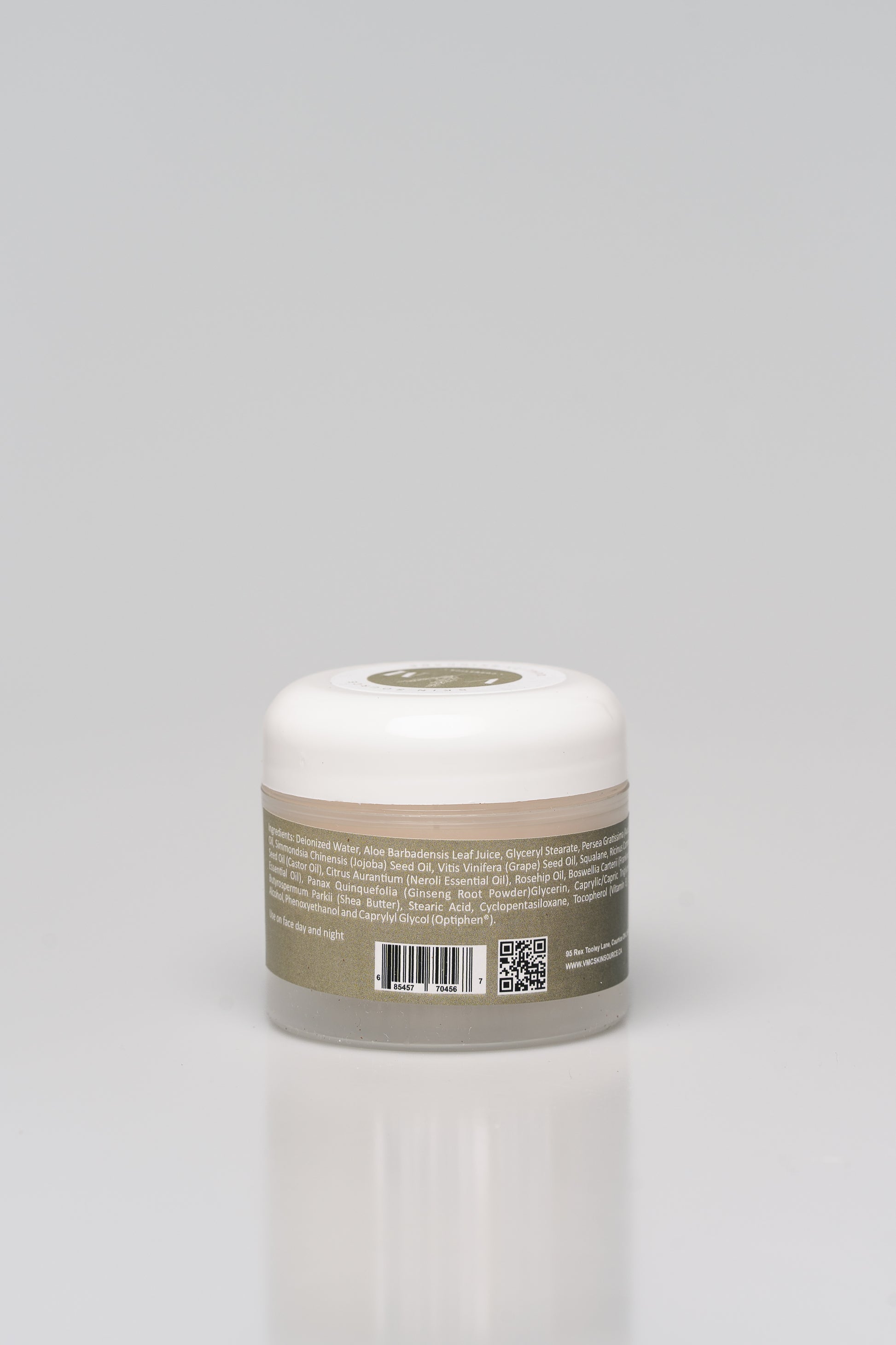 Deionized water, Aloe Barbadensis Leaf Juice, Glyceryl Stearate, Persea Gratissima (Avocado) Oil, Simmondsia Chinensis (Jojoba) Seed Oil, Vitis Vinifera (Grape) Seed Oil, Squalane, Ricinus Cummunis Seed Oil (Castor Oil), Citrus Aurantium (Neroli Essential Oil), Rosehip Oil, Boswellia Carterii (Frankincense Essential Oil), Panax Quinquefolia (Ginseng Root Powder) Glycerin, Caprylic/Capric Triglyceride, Butyrospermum Parkii (Shea Butter), Stearic Acid, Cyclopentasiloxane, Tacopherol (Vitamin E), Cetyl Alcohol, Phenoxyethanol and Caprylyl Glycol.