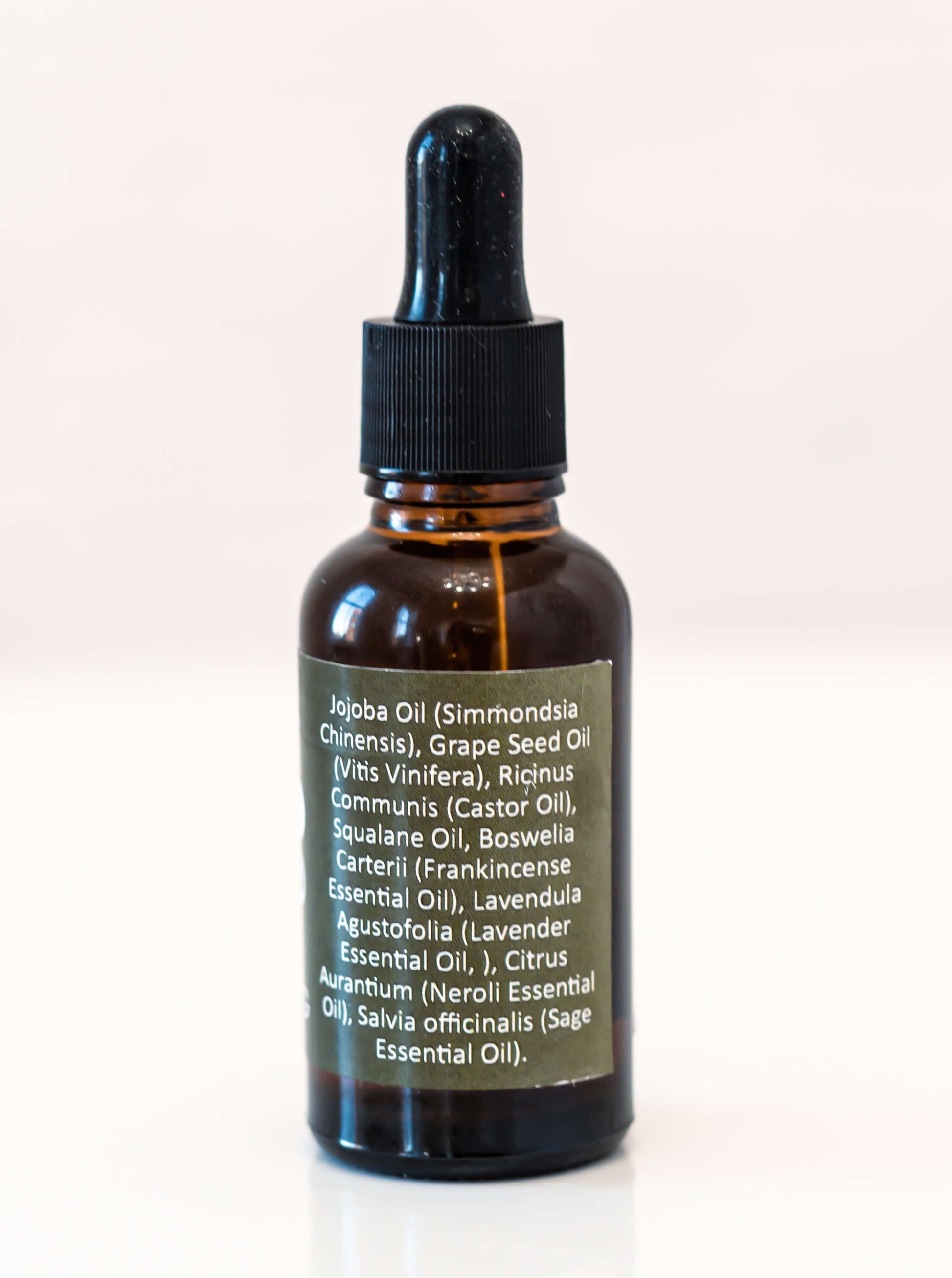 Jojoba Oil (Simmondsia Chinensis), Grape Seed Oil (Vitis Vinifera), Ricinus Communis (Castor Oil), Squalane Oil, Boswelia Carterii (Frankincense Essential Oil), Lavendula Agustofolia (Lavender Essential Oil, ), Citrus Aurantium (Neroli Essential Oil), Salvia officinalis (Sage Essential Oil).