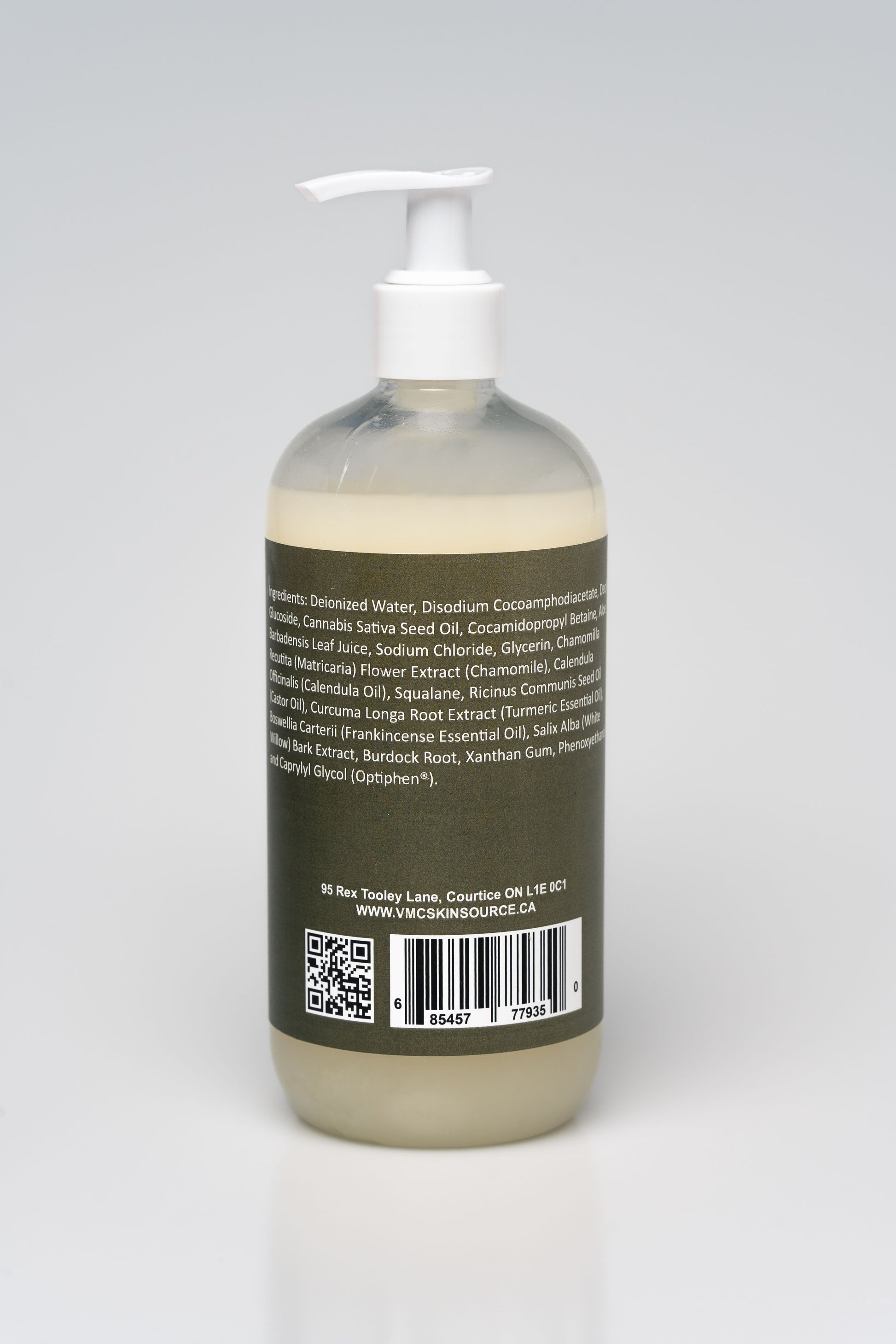 Deionized water, Disodium Cocoamphodiacetate, Decyl Glucoside, Cannabis Sativa Seed Oil, Cocamidopropyl Betaine, Aloe Barbadensis Leaf Juice, Sodium Chloride, Glycerin, Chamomilla Recutita (Matricaria) Flower Extract (Chamomile) Calendula Officinalis (Calendula Oil), Squalane, Ricinus Cummunis Seed Oil (Castor Oil), Curcuma Longa Root Extract (Turmeric Essential Oil), Boswellia Carterii (Frankincense Essential Oil), Salix Alba (White Willow) Bark Extract, Burdock Root, Xanthan Gum, Phenoxyethanol and Caprylyl Glycol.