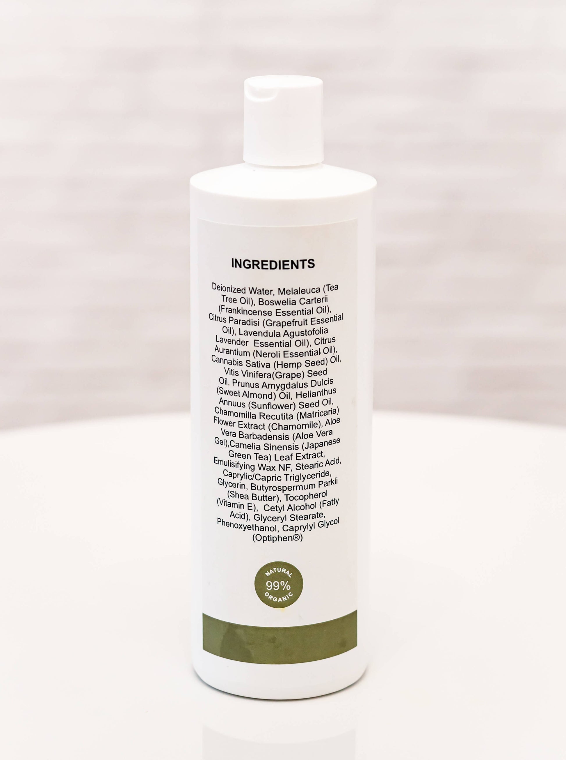 Deionized Water, Melaleuca (Tea Tree Oil), Boswelia Carterii (Frankincense Essential Oil), Citrus Paradisi (Grapefruit Essential Oil), Lavendula Agustofolia (Lavender Essential Oil), Citrus Aurantium (Neroli Essential Oil), Cannabis Sativa (Hemp Seed) Oil, Vitis Vinifera(Grape) Seed Oil, Prunus Amygdalus Dulcis (Sweet Almond) Oil, Helianthus Annuus (Sunflower) Seed Oil, Chamomilla Recutita (Matricaria) Flower Extract (Chamomile), Aloe Barbadensis Leaf Juice, Camelia Sinensis (Japanese Green Tea) Leaf Extract, Emulsifying Wax NF, Stearic Acid, Caprylic/Capric Triglyceride, Glycerin, Butyrospermum Parkii (Shea Butter), Tocopherol (Vitamin E), Cetyl Alcohol (Fatty Acid), Glyceryl Stearate, Phenoxyethanol, Caprylyl Glycol (Optiphen®)